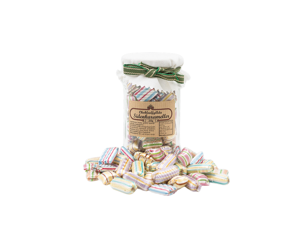 A pretty glass jar completely filled with old fashioned chocolate-filled candies.