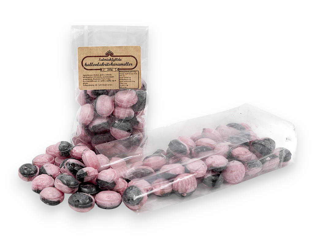 Salmiakfyllda hallonlakritskarameller 200g